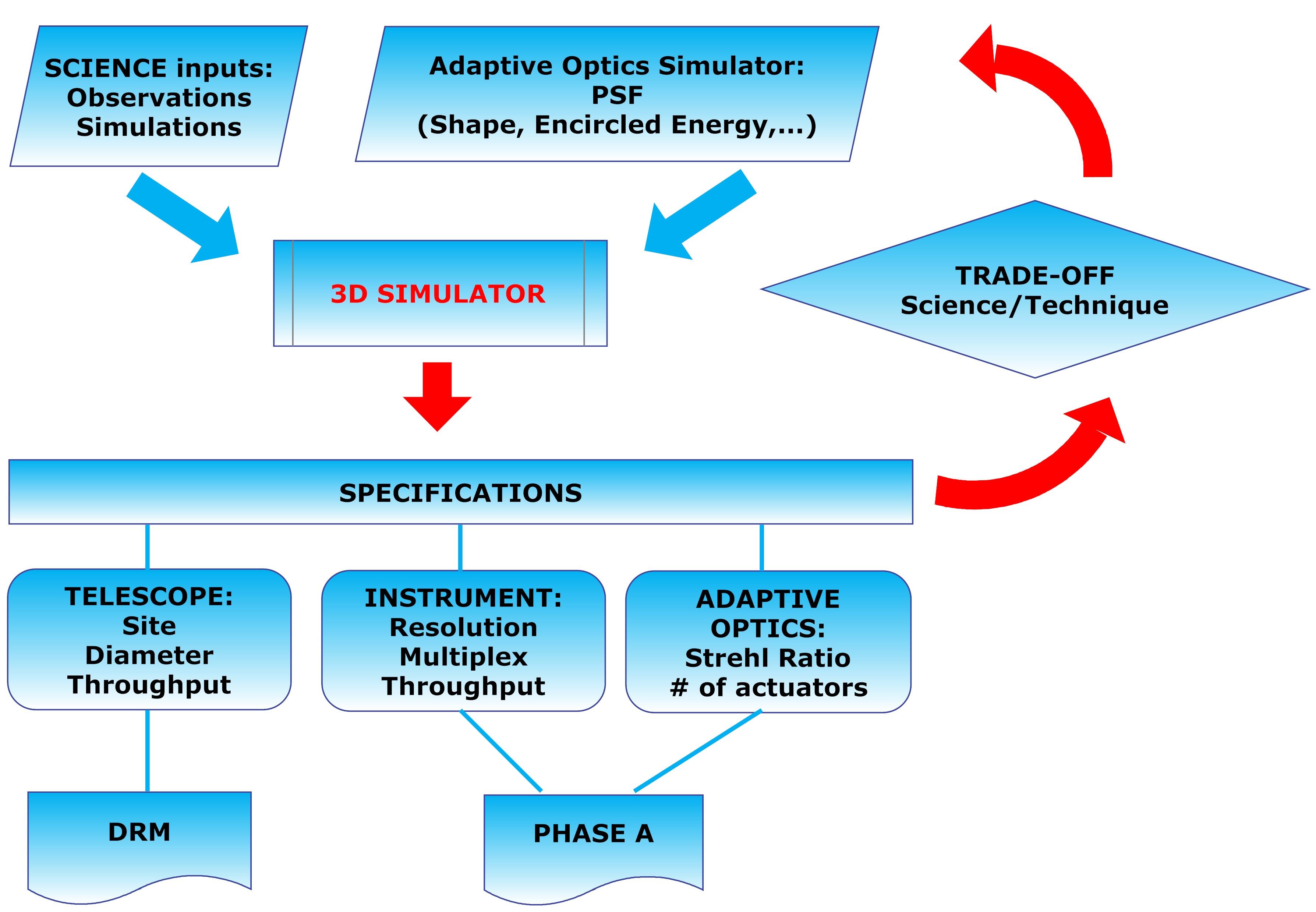 parameters related to the telescope (e.g., diameter, throughput, thermal background), instrument (e.g., resolution, multiplex), and adaptive optics system (e.g., ensquared energy, number of actuators, number of GS). This parameter space can be constrained relatively to a given scientific goal (e.g., distinguishing a rotating disk from a galaxy merger). By successive iterations, one can find the optimal set of parameters to reach this science goal, which will in turn help deriving optimal trades-off between science and technical constrains.